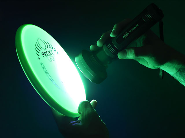 The biggest, brightest, and best UV Flashlight from MVP is here — the MVP Extra Large 100 LED UV Flashlight is the ideal tool for charging Eclipse 2.0 plastic! This extra large flashlight charges UV reactive materials in record time, leaving you with more time to focus on playing and less time worrying about charging your discs. Powered by 6 AA batteries (included) and featuring sturdy metal casing, the 100 LED UV Flashlight quickly and efficiently charges Eclipse Glow plastic when applied directly to the glow surface. Pick up an Extra Large 100 LED UV Flashlight today and Glow The Sport!